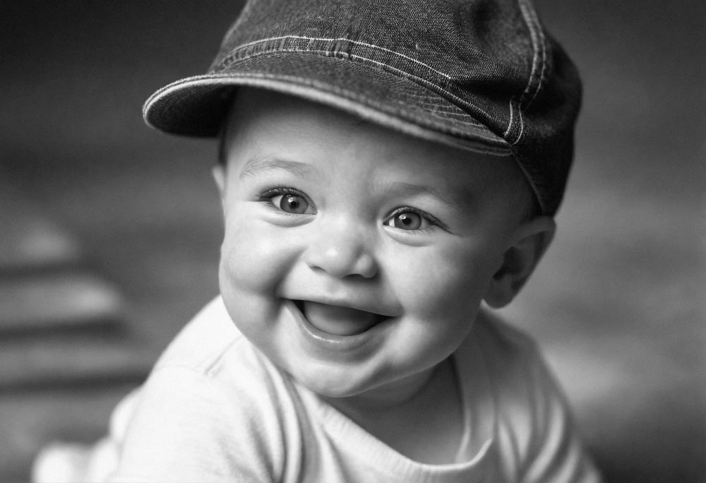 صورة كلاسيكية بالأبيض والأسود لطفل عمره ستة أشهر ينظر للأعلى ببراءة. ركز على التباين بين ملمس البشرة الناعمة والنسيج المحيط.