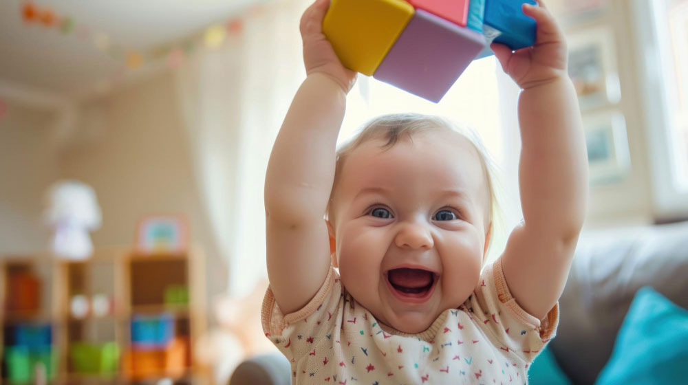 صورة مشرقة لطفل عمره أربعة أشهر يضحك بفرح بفم مفتوح، جالسًا بدعم ويرتدي بذلة صفراء. الخلفية جدار فاتح مع إضاءة طبيعية مشرقة.