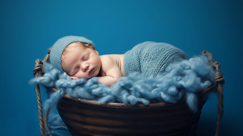 Generate a close-up shot of a newborn baby boy sleeping peacefully. He is wrapped in a soft, light blue knitted blanket, with tiny fingers resting near his chin. Use soft, natural studio lighting. Focus sharply on his face while keeping the background blurred (shallow depth of field) for a cozy feel