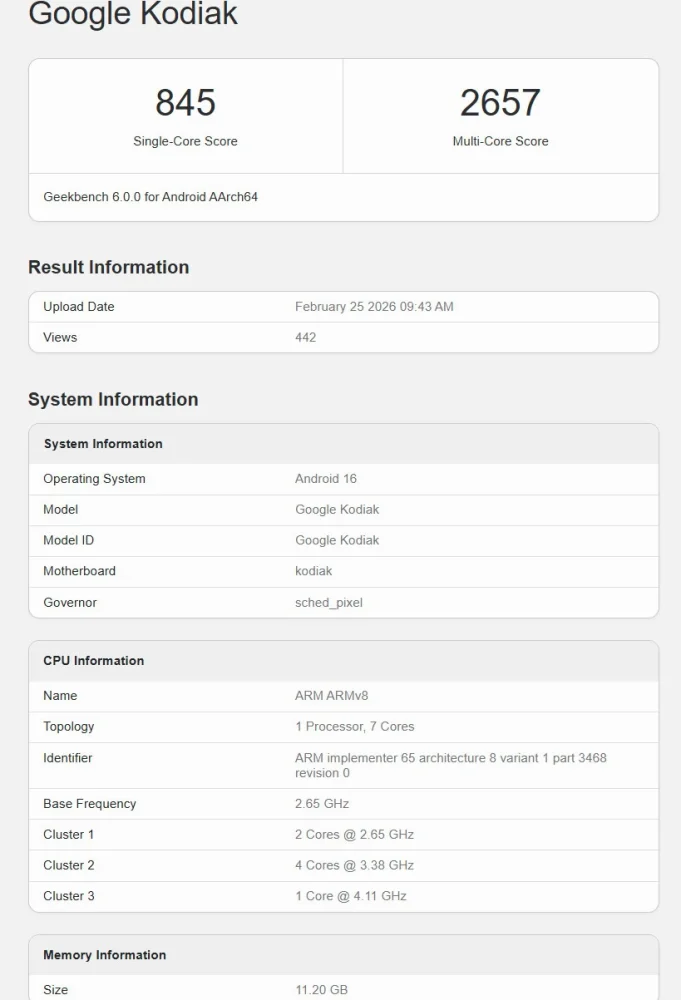 ظهر إدراج جديد على منصة Geekbench يكشف عمّا قد يكون معالج Google Tensor G6 (الاسم الرمزي “Kodiak”)، مع تكوين غير معتاد يضم 7 أنوية: نواة واحدة من نوع Arm C1-Ultra بتردد 4.11 جيجاهرتز، وأربع أنوية C1-Pro بتردد 3.38 جيجاهرتز، ونواتين C1-Pro بتردد 2.65 جيجاهرتز، إلى جانب معالج رسومي من سلسلة PowerVR C-Series.