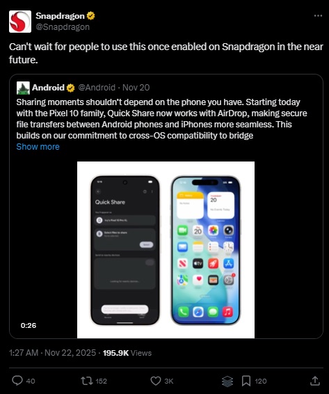 الآن، أكدت كوالكوم عبر الحساب الرسمي لمنصة Snapdragon على موقع X أن ميزة Quick Share إلى AirDrop في طريقها للوصول إلى أجهزة تعمل بمعالجات Snapdragon. وجاء التأكيد عبر إعادة نشر إعلان جوجل مع تعليق تشويقي قصير: “لا نستطيع الانتظار لرؤية المستخدمين يستمتعون بهذه الميزة عند تفعيلها على Snapdragon قريباً”.