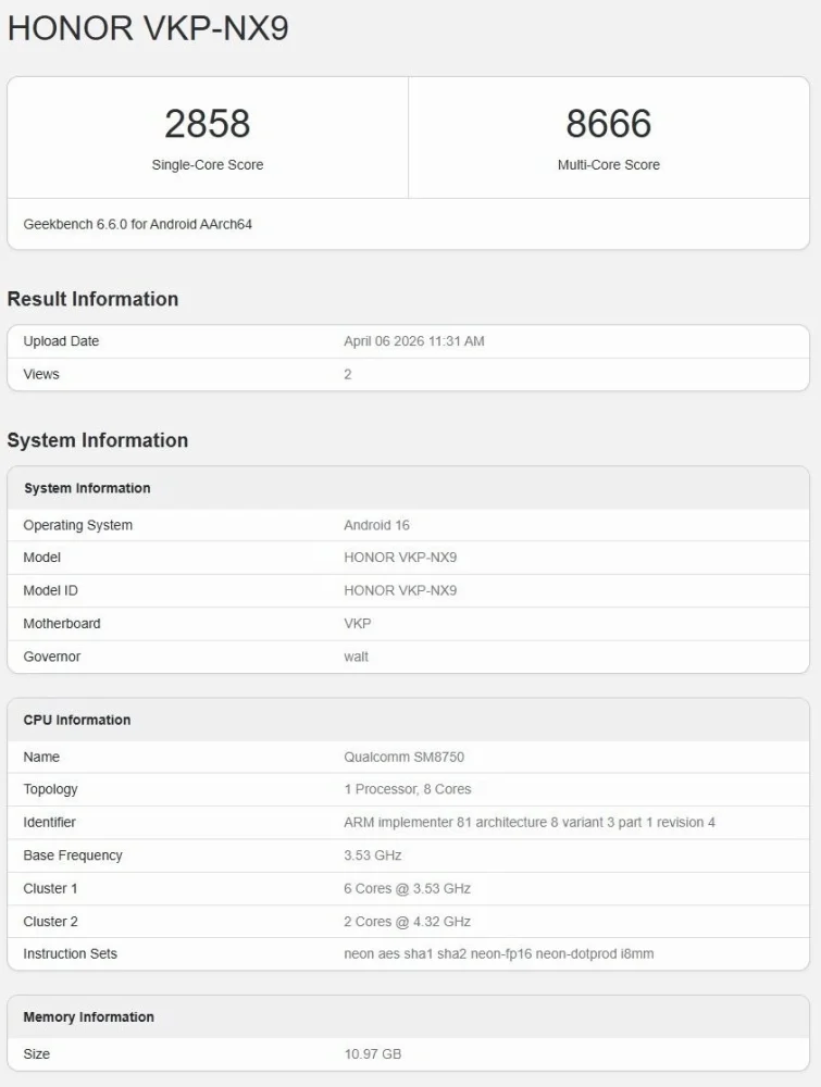 وبحسب البيانات، يحمل الهاتف رقم الطراز HONOR VKP-NX9، وقد تم اختباره على إصدار Geekbench 6.6.0، حيث حقق النتائج المذكورة سابقًا. كما تؤكد القائمة وجود ذاكرة عشوائي بسعة 12 جيجابايت، مع احتمالية توفر خيارات أخرى عند الإطلاق، وسيعمل بنظام Android 16.
