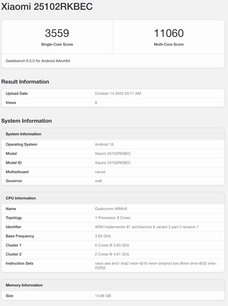 ظهر الهاتف على المنصة برقم الطراز “25102RKBEC”، وتُظهر القائمة أنه يعمل بنظام التشغيل Android 16، ويأتي بمعالج Snapdragon 8 Elite Gen 5 مع ذاكرة وصول عشوائي سعتها 16 جيجابايت. وهو أحدث معالج رائد من شركة كوالكوم، و نفس المعالج المستخدم في سلسلة Xiaomi 17 المتقدمة.