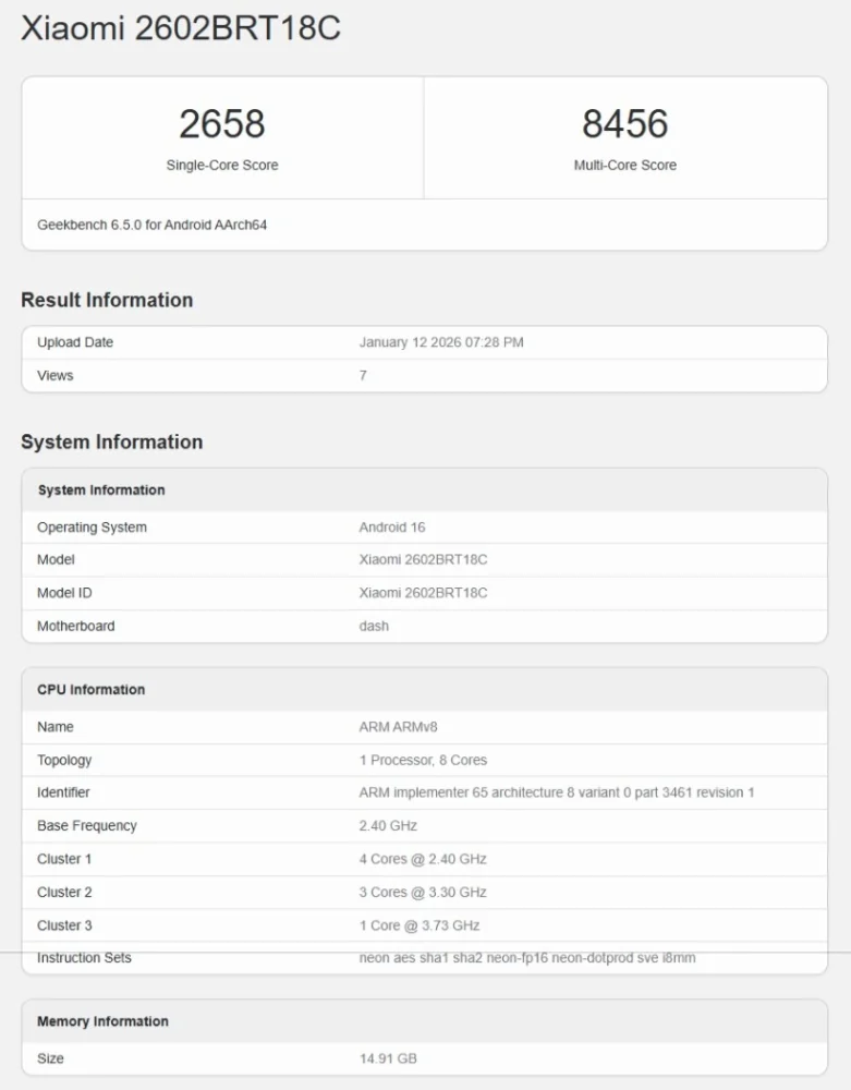 يحمل الهاتف، وفق منصة Geekbench، رقم الطراز 2602BRT18C، وهو نفس الرقم الذي ظهر سابقاً في منصة الاعتماد الصينية 3C. وحقق الهاتف نتيجة 2,658 نقطة في اختبار النواة الواحدة، و8,456 نقطة في اختبار الأنوية المتعددة. وتُعد هذه النتائج تنافسية ضمن فئة الهواتف المتوسطة العليا، لكنها لا تصل إلى مستوى الهواتف الرائدة فائقة الأداء.