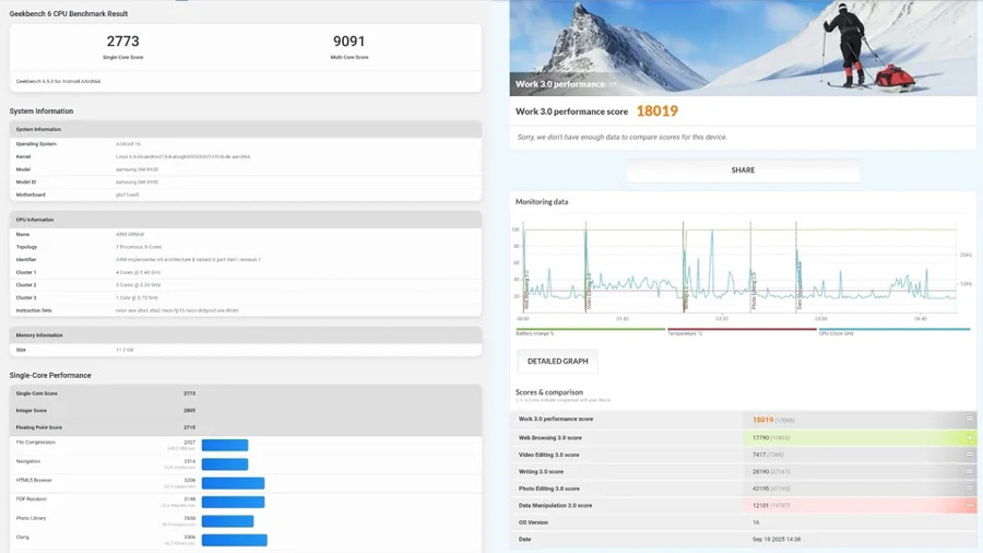 وفي اختبارات Geekbench 6، استطاع التاب S11 Ultra الوصول إلى 2773 و 9091 نقطةً في المهام وحيدة ومتعددة النوى على الترتيب، وبالتالي يمكننا التعامل مع المهام المتعددة بسلاسة عالية، فيما توقف الجهاز S10 Ultra عند حدود 2079، و 7242 نقطة، وتفوّق عليهما الجهاز المنافس iPad Pro بما يقارب 3679 و 14647 نقطة، وفي ذات الوقت سجل تاب سامسونج الأخير 18019 نقطة في اختبارات الرسوم PCMark Work 3.0 ولم يرتفع S10 Ultra عن 15,598 نقطة.